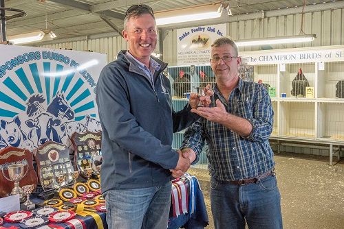 Major Winners Champion Bird in Show- Large Black Cockerel- Sonya Ford Reverve Champion Bird in Show- Bantam Black Cockerel- Chris Hardman Reserve Champion Large- Black Hen- Steve Parker Reserve Champion Bantam- Sonya Ford Champion Pairs- Bantam Buff Adam & Megan Gavenlock Clive Claus Breeders Plate- Jordan McKeown Colour Champions Champion Black in Show- Large Ckl- Sonya Ford Champion Blue in Show- Btm Ckl- Sonya Ford Champion Buff in Show- Btm Ckl- Sonya Ford Champion White in Show- Large Hen- Karen Bussian Champion Cuckoo in Show- Large Hen- Karen Bussian Champion Splash in Show- Large Pullet- Sonya Ford Champion AORC- Choc Pullet- Sonya Ford Class Cups (>10 entries per class) Large Black Hen-15-Steve Parker Large Black Ckl-18-Sonya Ford Large Black Pullet-31-Tim Tydd Large Buff CKL-23-Sonya Ford Large Buff Pullet-39-Megan Gavenlock Large Blue Pullet-11-Kate Goulding Bantam Black Hen-15-Jordan McKeown Bantam Black Ckl-26-Chris Hardman Bantam Black Pullet-31-Steve Parker